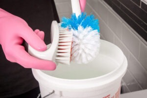 Prepare um balde com água morna (cerca de 6 litros), adicione 3 colheres de sopa de bicarbonato de sódio e deixe a escova de molho cerca de 30 minutos . Se necessário, escove as cerdas. Em seguida, coloque o utensílio para secar.